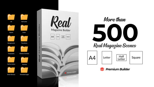 Real Magazine Builder هو نموذج أفتر إيفيكتس يحتوي على كل ما تحتاجه لعرض مجلتك الترويجي التالي! فقط قم بتنزيل وابدأ في إنشاء عروض ترويجية أنيقة للمجلات على الفور. إنه سهل الاستخدام للغاية – ما عليك سوى فتح ملحق Premium Builder المضمن ، وتحديد نمط المجلة الذي تحتاجه ، واختيار الرسوم المتحركة المطلوبة ، ووضع تصميماتك ، وضبط الألوان والأنماط لتتناسب بشكل أفضل مع علامتك التجارية ، وستكون جاهزًا للانطلاق! احصل على مشروعك بشكل أسرع وأسهل بينما لا يزال يبدو فريدًا!