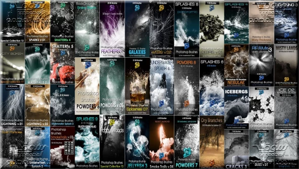 قطرات الماء ، البرق ، SHATTER FX 5 ، Glass Shatter Fx ، الرذاذ ، المجرات ، SmokeTrails ، الشرارات ، السماء ، تحت الماء ، الشلالات ، الشقوق ، الأرض الخلفية ، الريش ، قنديل البحر ، الشبكات ، الأشجار ، المساحيق ، الحطام ، الضباب ، الحزم ، الجليد ، الصواريخ الإطلاق ، Misty Lands ، Bokeh ، Dry Branches و Nebulae Brushes.