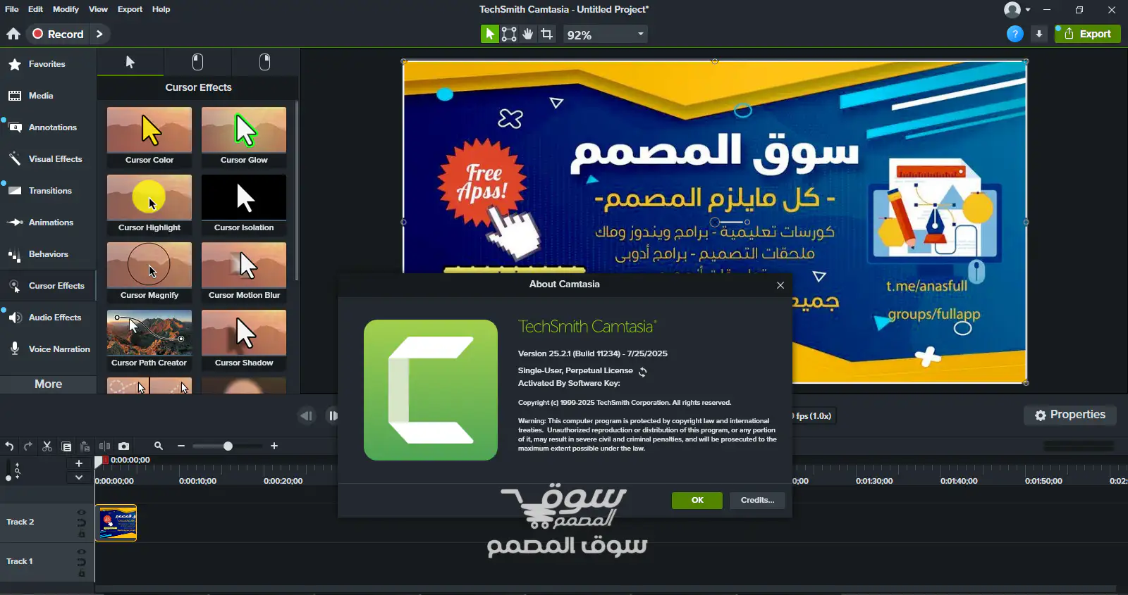 TechSmith Camtasia 25.2.1 Build 11234 Registered Version هو أداة شاملة وسهلة الاستخدام لتسجيل الشاشة وتحرير الفيديو، تلبي احتياجات صناع المحتوى، المعلمين، والمسوقين في 2025. مع ميزات مثل Camtasia Rev، تأثيرات المؤشر الديناميكية، وأدوات الذكاء الاصطناعي، يقدم البرنامج تجربة إنتاج فيديو احترافية وسريعة. تحسينات الأداء وإصلاحات الأخطاء في هذا الإصدار تجعله خيارًا موثوقًا لإنشاء محتوى جذاب. لتجربة الإصدار، يُوصى بتحميل النسخة التجريبية المجانية من الموقع الرسمي www.techsmith.com لضمان الحصول على نسخة آمنة ومحدثة.