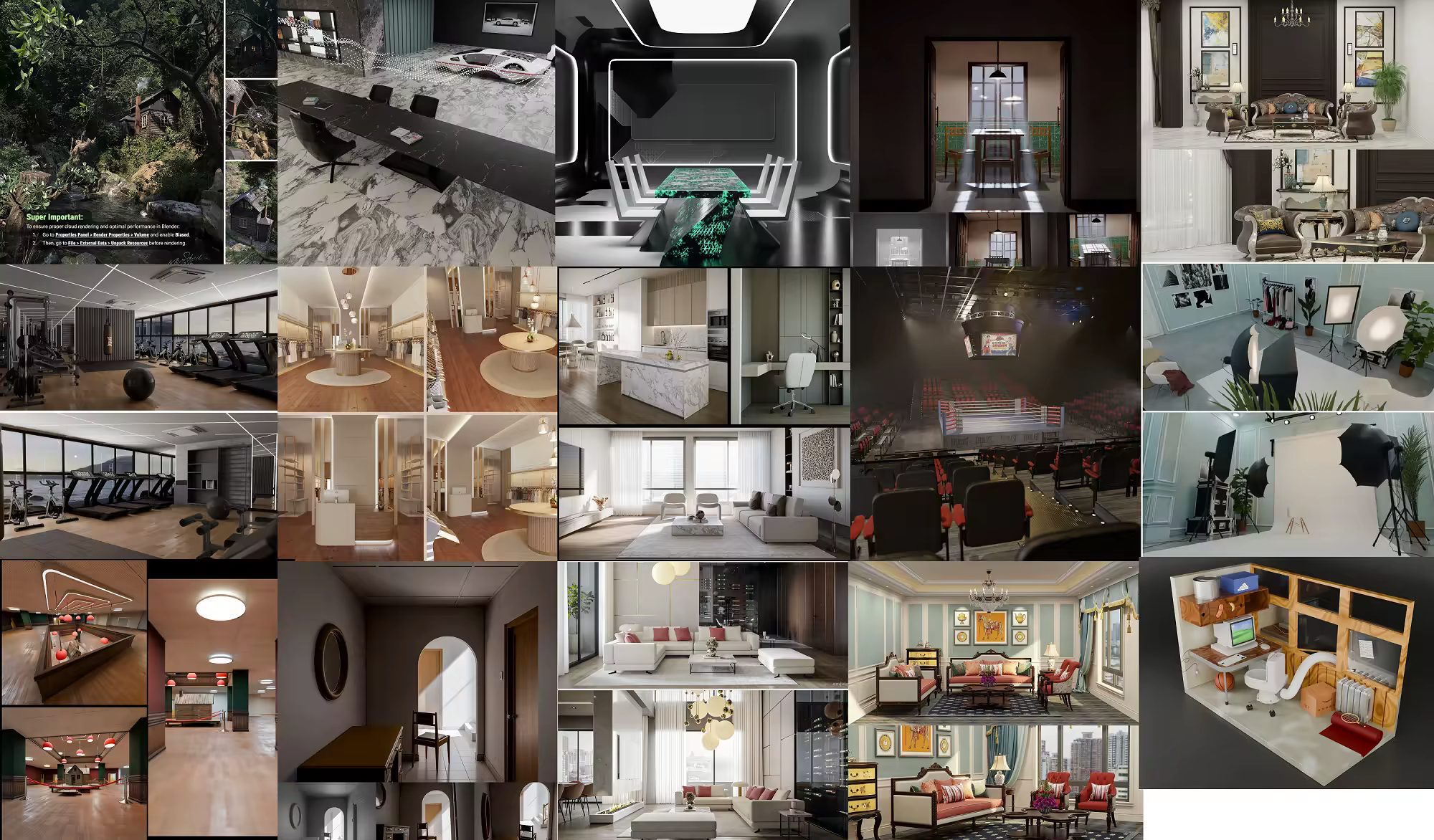 - مشاهد كاملة (Full Scenes): غرف معيشة، مطابخ حديثة، ومكاتب عمل مجهزة بالكامل بالإضاءة والإعدادات الجاهزة للرندر.